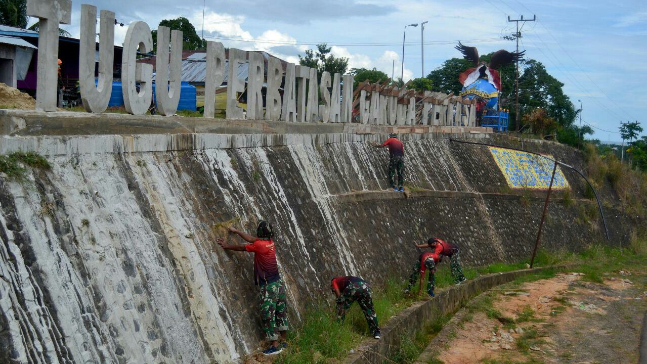 JAMBIDAILY SURABAYA – Prajurit Pasmar 2 Korps Marinir yang tergabung dalam Satgasmar Ambalat XXVI Pengamanan perbatasan RI-Malaysia BKO Guspurla Koarmada II melaksanakan perawatan monumen Tugu Garuda Perkasa di Desa Seberang, Kec. Sebatik Utara, Kab. Nunukan, Kalimantan Utara, Jum’at (01/01/2020).