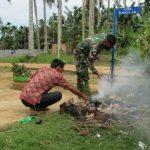 Tampak Pasiter Kodim Mayor Inf Beni bersama warga dan personel Satgas yang saat itu sedang meninjau lokasi TMMD ikut langsung membawa potongan kayu tersebut.