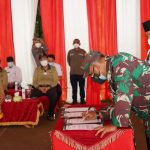 Penutupan TMMD Ke-111 Kodim 0420/Sarko ditandai dengan penandatangan naskah serah terima pekerjaan TMMD dari Dandim 0420/Sarko Letkol Inf Tomi Radya Diansyah Lubis, S.A.P. M.Han kepada Pj Bupati Merangin H. Mashuri,S.Pd.,M.M serta penyerahan bingkisan oleh Danrem.