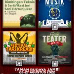 JAMBIDAILY SENI, Budaya – Dinas Kebudayaan dan Pariwisata provinsi Jambi UPTD Taman Budaya Jambi (TBJ) persembahkan pentas apresiasi seni musik bertajuk “Tegak Negeri” karya Sanggar Chan-pi di Gedung Teater Arena Taman Budaya Jambi (Minggu, 21/08/2022).