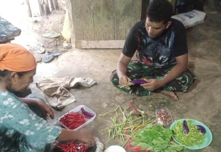 Tidak hanya memasak, anggota Satgas juga berbincang santai dengan Ibu Ros, mendengarkan cerita-ceritanya tentang kehidupan di desa. Mereka bercanda, tertawa, dan menikmati kebersamaan yang sederhana tetapi penuh makna.