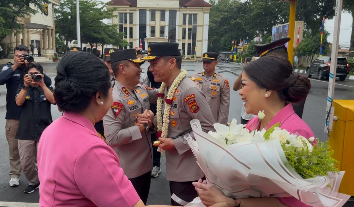 Tiba di Mapolda Jambi, Irjen Pol Krisno H Siregar disambut oleh Irjen Pol Drs Rusdi Hartono beserta Istri dan dilakukan pengalungan bunga dan selanjutnya menerima laporan kesatuan.