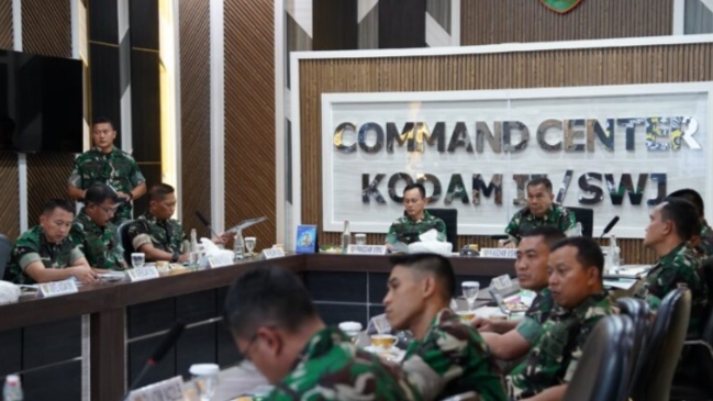 JAMBIDAILY MILITER — Pangdam II/Sriwijaya Mayjen TNI Ujang Darwis, M.D.A., menerima paparan Dansatgas terkait kesiapan pelaksanaan TNI Manunggal Membangun Desa (TMMD) ke-124 Tahap II TA 2025 di Ruang Puskodalopsdam II/Swj Palembang, Jumat, 2 Mei 2025.