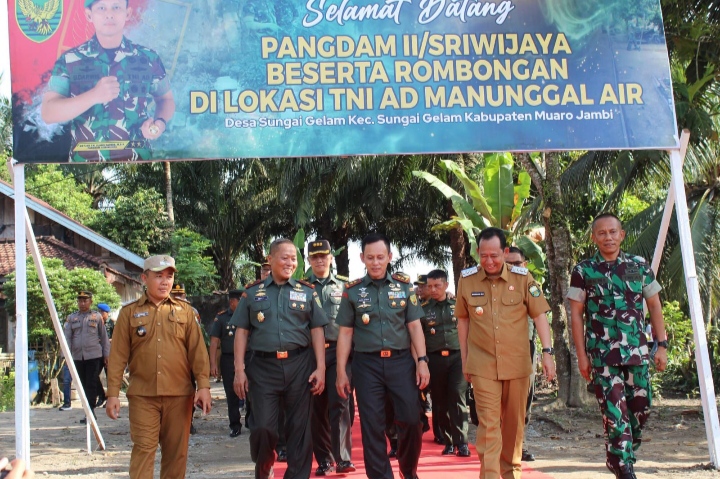 JAMBIDAILY MUARO JAMBI – Panglima Kodam II/Sriwijaya Mayjen TNI Ujang Darwis, M.D.A., melakukan kunjungan kerja ke lokasi Program TNI AD Manunggal Air di RT 09 Desa Sungai Gelam, Kecamatan Sungai Gelam, Kabupaten Muaro Jambi, Senin (26/5/2025). Kegiatan ini menjadi bagian dari komitmen TNI AD dalam meningkatkan kesejahteraan masyarakat melalui penyediaan akses air bersih.