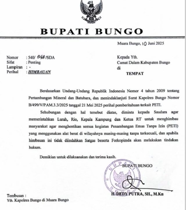 Tak main-main, Pemkab Bungo telah mengeluarkan surat himbauan penting yang ditujukan kepada seluruh camat di wilayah Kabupaten Bungo untuk segera mengambil langkah tegas dalam menghentikan aktivitas Penambangan Emas Tanpa Izin (PETI) di daerah masing-masing.