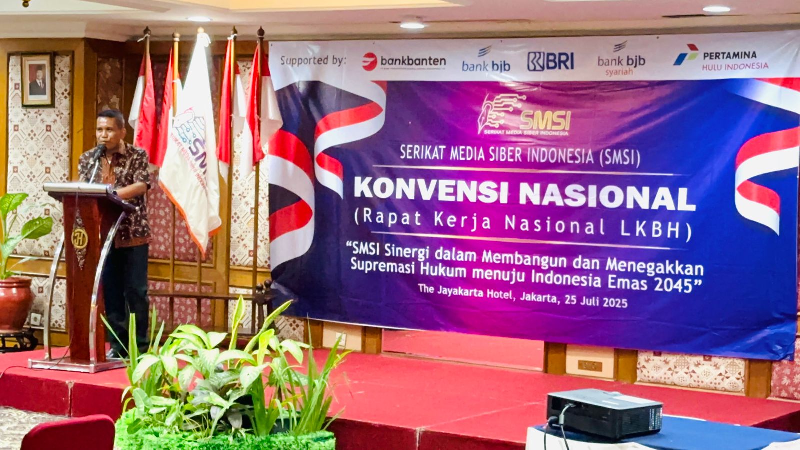 JAMBIDAILY.COM – Serikat Media Siber Indonesia (SMSI) Pusat menggelar konvensi nasional dengan mengusung tema SMSI sinergi dalam membangun dan menegakkan supremasi hukum menuju Indonesia Emas 2045, bertempat di The Jayakarta, Jum’at (25/7/2025).