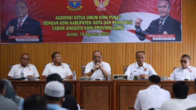 Hal ini disampaikannya saat audiensi dengan KONI kabupaten/kota dan pengurus provinsi cabang olahraga (Pengprov Cabor) anggota KONI Provinsi Jambi di Aula KONI Provinsi Jambi, Minggu 10 Agustus 2025.