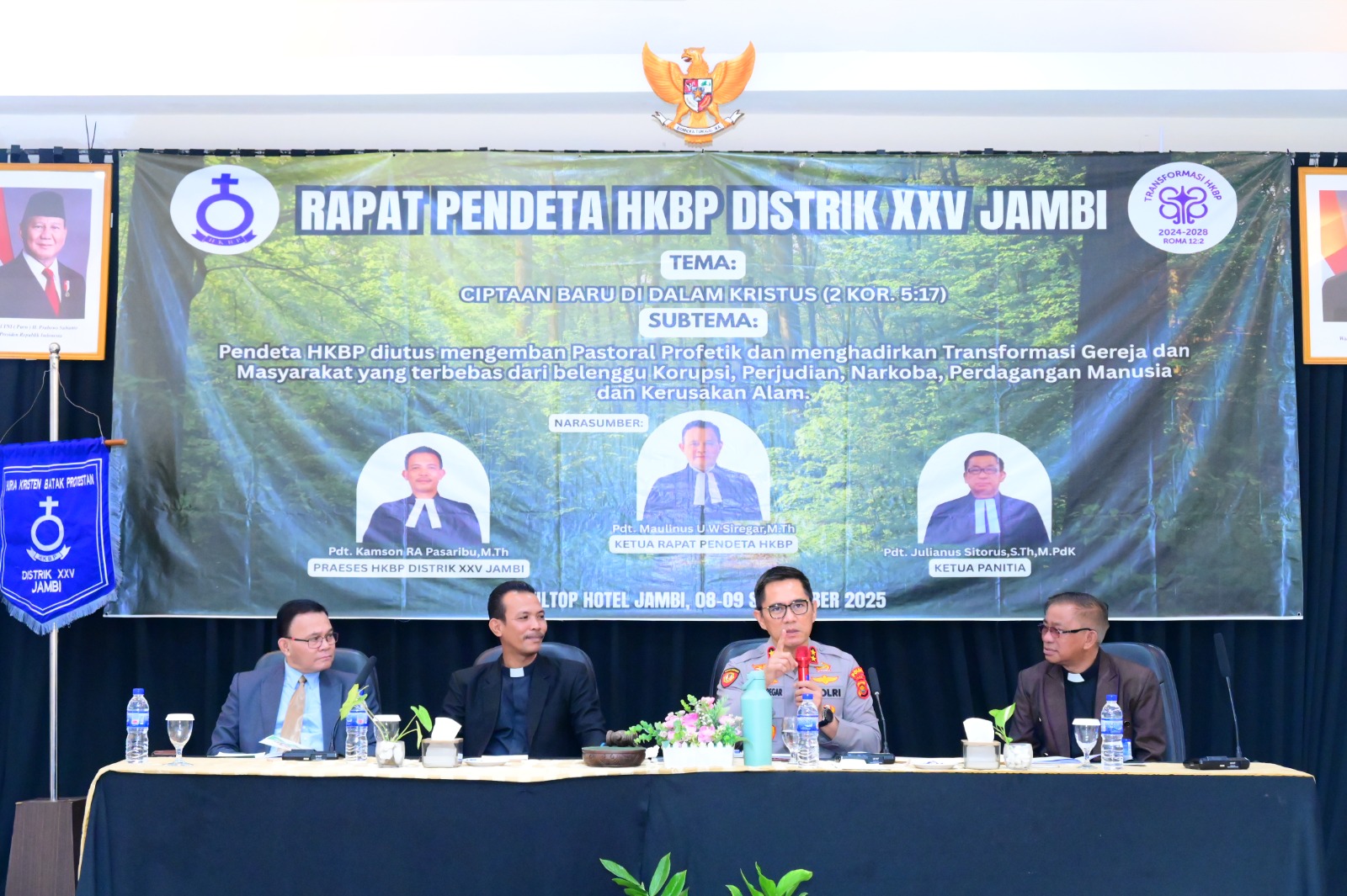 Dalam paparannya, Kapolda Jambi menekankan pentingnya persiapan menuju Visi Indonesia Emas 2045 yang menargetkan Indonesia menjadi negara maju dan makmur di usia 100 tahun kemerdekaan. Ia menilai HKBP memiliki peran penting dalam mencetak “Generasi Bintang” yang unggul, sehat jasmani dan rohani, serta berkarakter takut akan Tuhan.
