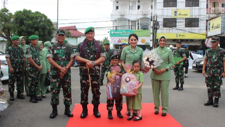 Tiba di Makorem 042/Gapu, rombongan Pangdam XX/TIB disambut dengan tradisi penyambutan, pengalungan sal, serta pemberian hand bucket kepada Ibu Ketua Persit oleh anak-anak TK Kartika Korem.