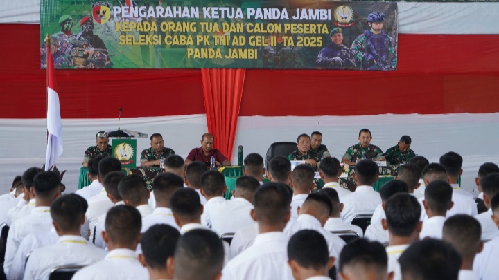 JAMBIDAILY.COM – Komandan Korem (Danrem) 042/Gapu Brigjen TNI Heri Purwanto memberikan pengarahan kepada orang tua dan peserta seleksi Calon Bintara Prajurit Karier (Caba PK) TNI AD Gelombang II Tahun Anggaran 2025, Selasa (23/9/2025), di Lapangan Tenis Indors Korem 042/Gapu, Jambi.