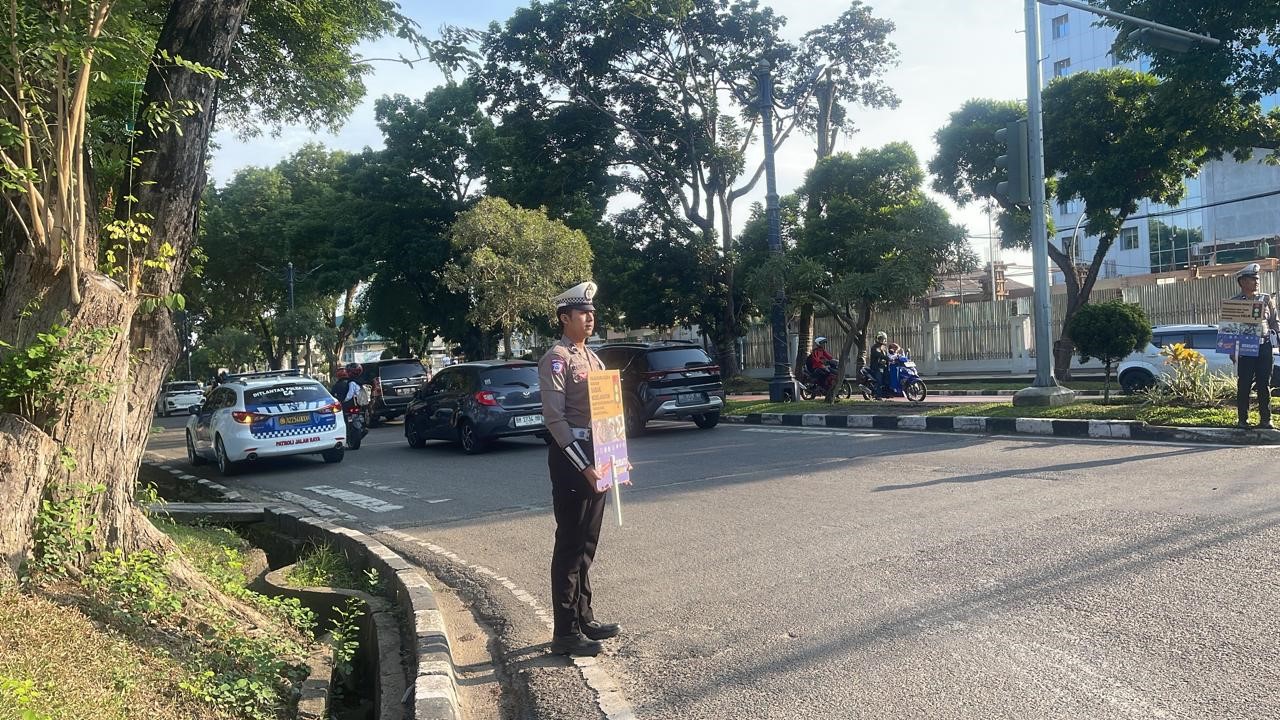 Personel Subdit Kamsel Ditlantas Polda Jambi yang memberikan himbauan kepada para pengguna jalan roda dua (R2) dan roda empat (R4) agar selalu tertib dalam berlalu lintas.