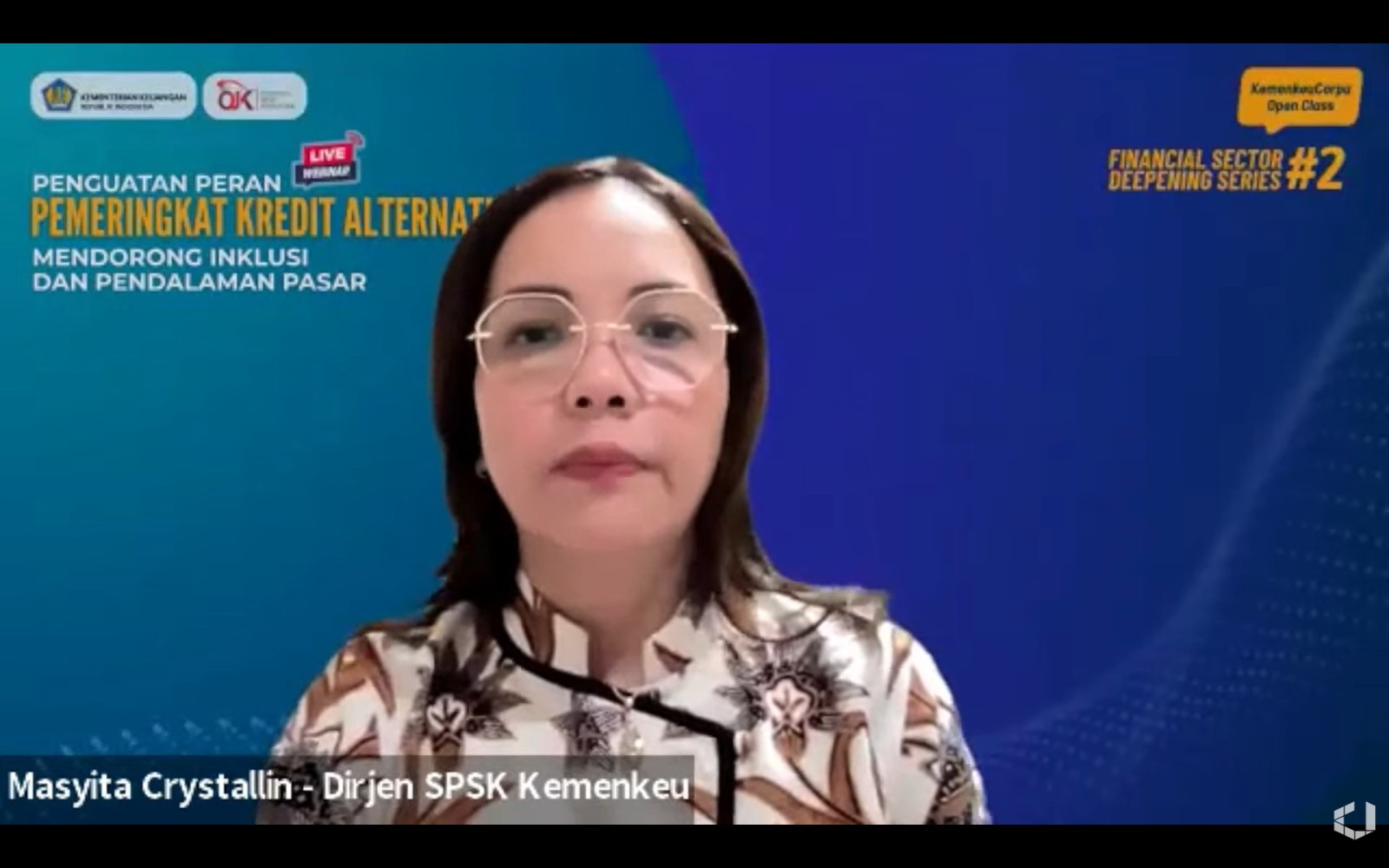 Dalam kesempatan yang sama, Direktur Jenderal Stabilitas dan Pengembangan Sektor Keuangan Kemenkeu RI Masyita Crystallin menyampaikan mengenai peran penguatan pemeringkat kredit alternatif dalam strategi pembiayaan dan pengembangan sektor keuangan yang inklusif.