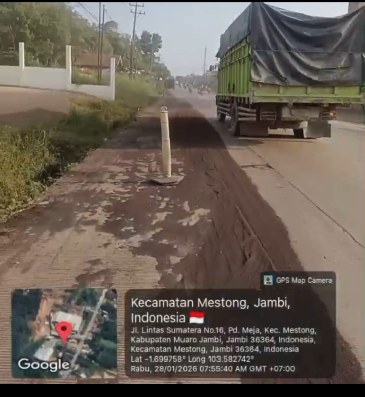 JAMBIDAILY.COM- Warga keluhkan tumpahan batubara di sepanjang jalan lintas Sumatra pondok Meja Kecamatan Mestong Kabupaten Muaro Jambi, tepatnya didepan rumah Kepala Desa Pondok Meja.