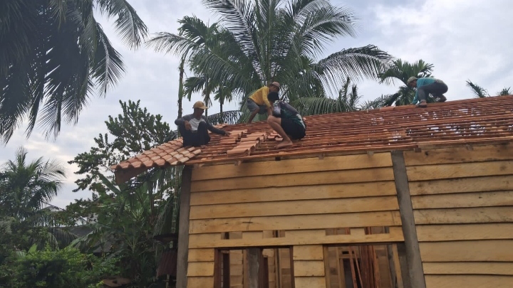 Di Desa Petajen, Kecamatan Bajubang, Kabupaten Batanghari, personel Satgas TMMD bersama warga setempat terlihat bahu-membahu memasang rangka kayu atap rumah milik Aris, salah seorang warga penerima manfaat program tersebut.