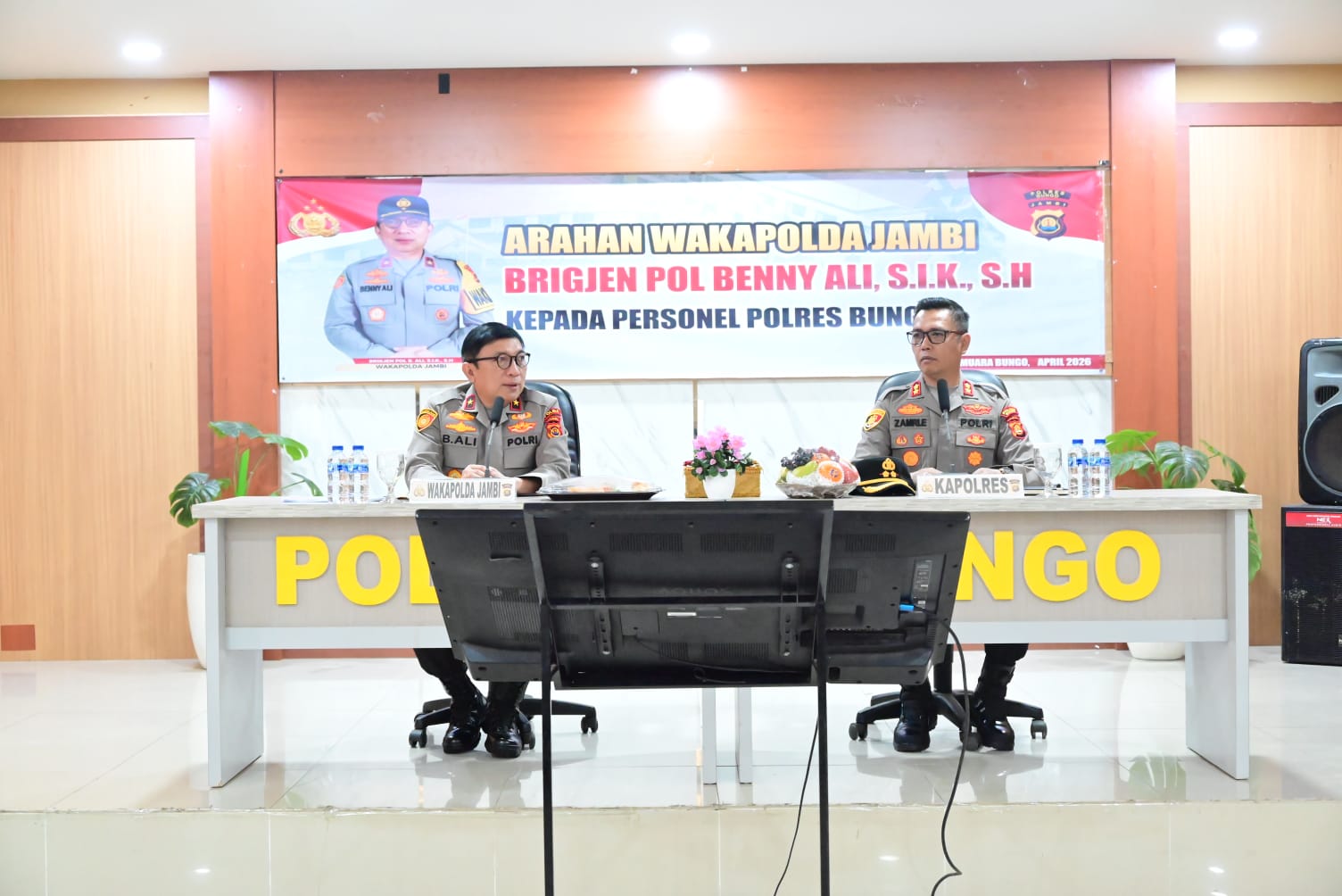 JAMBIDAILY.COM – Wakapolda Jambi Brigjen Pol. Benny Ali melaksanakan kegiatan tatap muka dan memberikan arahan kepada jajaran Polres di wilayah Polda Jambi, yakni Polres Tebo, Polres Bungo, dan Polres Merangin, pada Senin (13/4/2026).