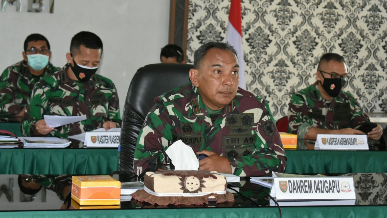 JAMBIDAILY SUARA TNI -Komandan Korem 042/Garuda Putih Brigjen TNI M. Zukfili, S.I.P, M.M menerima paparan satuan dalam rangka menghadapi Lomba Binter dan Lomba Binsat tingkat Kodam, Tahun Anggaran 2020-2021, secara virtual diruang rapat Makorem 042/Gapu, Jl. Jend Urip Sumohajo Kota Jambi, Selasa (2/2/2021).